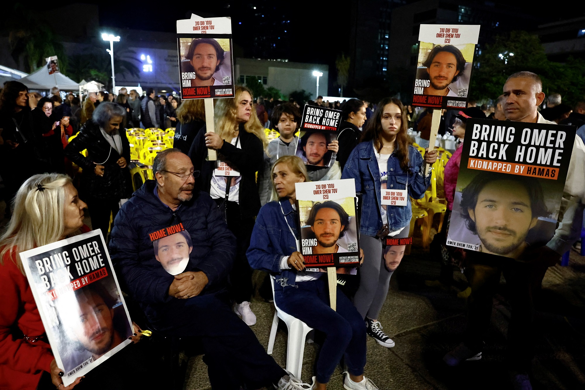 تجمع المئات من الإسرائيليين في ما بات يعرف باسم ساحة الرهائن في تل أبيب السبت للمطالبة بالإفراج عن نحو 140 شخصا لا يزالون محتجزين لدى حركة حماس في قطاع غزة.
