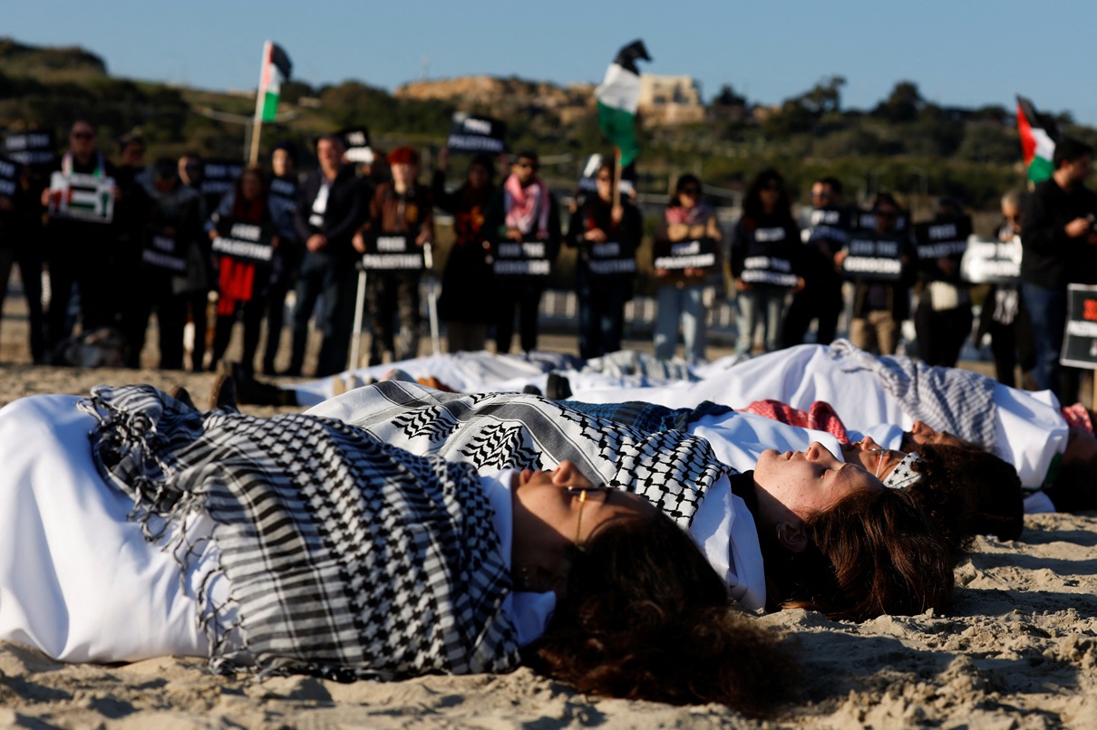 بالأكفان.. نشطاء في مالطا يحتجون ضد العدوان الإسرائيلي على غزة
