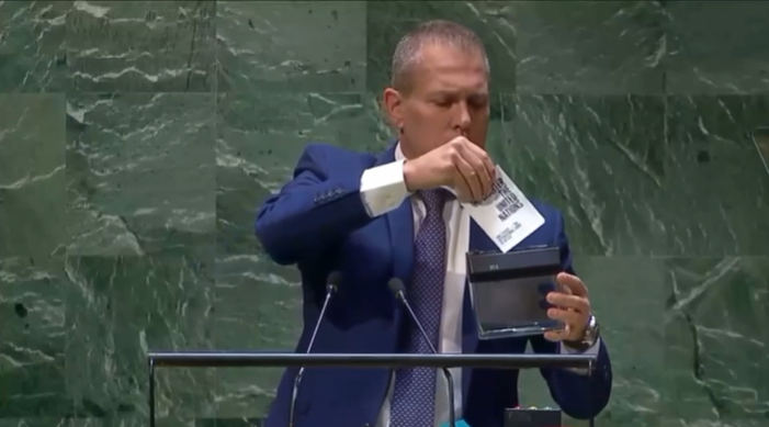 قام سفير إسرائيل في الأمم المتحدة، غلعاد أردان، اليوم الجمعة، بتمزيق ميثاق الأمم المتحدة بعد تصويت الجمعية العامة للأمم المتحدة بتوصية لمجلس الأمن بإعادة النظر في عضوية الفلسطينيين بشكل إيجابي.