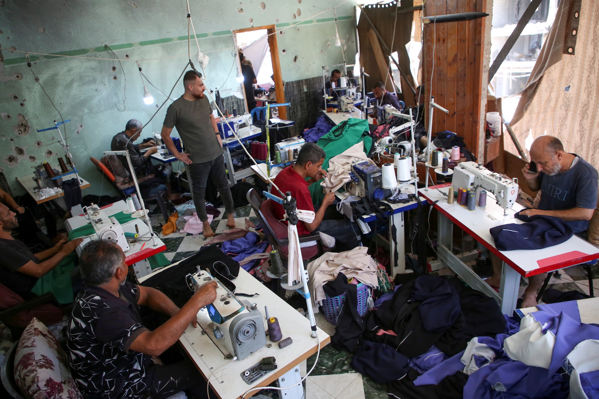في غرفة بالطابق العلوي خلف جدران متهدمة لمبنى في غزة، تطن آلات حياكة بينما يعمل رجال على طاولات مزدحمة، في إطار جهود رجل أعمال فلسطيني لمساعدة اقتصاد القطاع الذي يتعرض منذ تسعة أشهر للقصف الإسرائيلي.